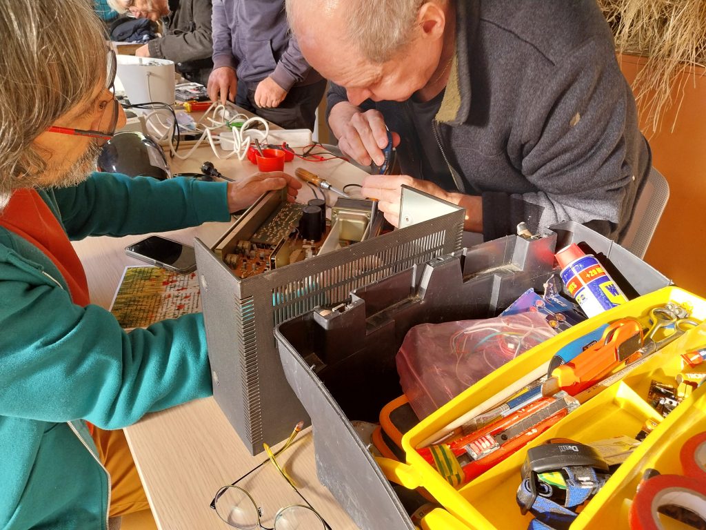 Des personnes se rencontrent périodiquement en un lieu déterminé (par exemple un café, une salle des fêtes ou un local associatif) et où ils peuvent réparer un objet qu’ils ont apporté, aidés par des volontaires.