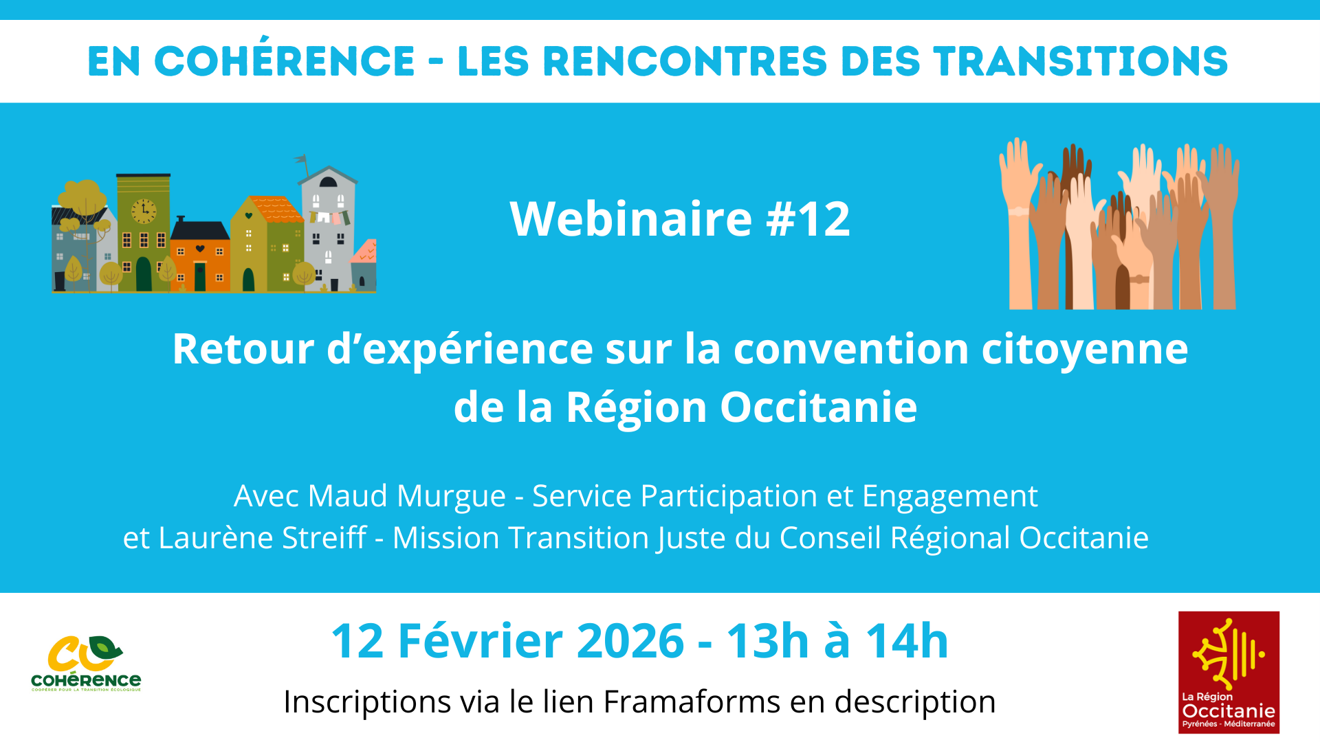 Lors d’un webinaire dédié au retour d’expérience de cette convention citoyenne, l’association Cohérence a le plaisir d’accueillir deux agents de la Région Occitanie qui ont été impliquées dans l’organisation de cette démarche participative : Maud Murgue, responsable du service Participation, Engagement et Eco-citoyenneté, et Laurène Streiff, directrice de la mission Performance et Innovations pour une Transition Juste.